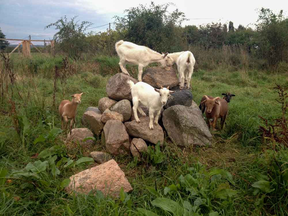 Im Sommer 2013 kamen unsere Schafe und Ziegen hinzu. Lilly, Lola und Lucas, damals drei Monate alt, sowie drei Ziegen, Zick, Zack und Zuck, alle noch nicht zahm. Während der Sommerferien haben viele Kinder sie liebevoll aus der Hand gefüttert und nun sind die drei Anfangs-Schafe zahm und haben schon fleißig Lämmchen bekommen. Im Sommer 2020 waren es immerhin 46 Lämmchen. Im Mai 2019 kam die zahme Hausziege „Earnie“ aus Paderborn hinzu.