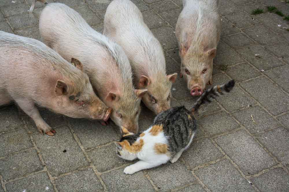 Im Sommer 2014 haben wir unseren Tierbestand um zwei Minischweine Rudi Rüssel und Miss Piggy erweitert. Auch hier haben die Kinder mit viel Begeisterung die Zähmung vorangetrieben, so dass die zwei nach den Ferien in ihr Außengehege umziehen konnten. Rudi Rüssel und Miss Piggy wurden im Sommer 2018 durch „Mucki“ unser Durocschwein ersetzt. Am 28.5.2019 bekam Mucki ihren ersten Wurf mit 10 gesunden Ferkeln. Die Schweine sind alle lieb und handzahm und stehen bei den Kindern hoch im Kurs.